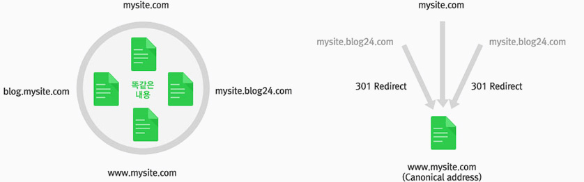 - HTML 마크업: 301 redirect가 어려울 경우, HTML 마크업 시 rel="canonical"을 이용해 대표 주소를 지정하세요.