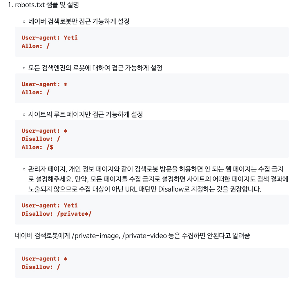 - 접근 권한 관리: robots.txt를 통해 검색로봇이 접근 가능한 영역을 설정하세요.