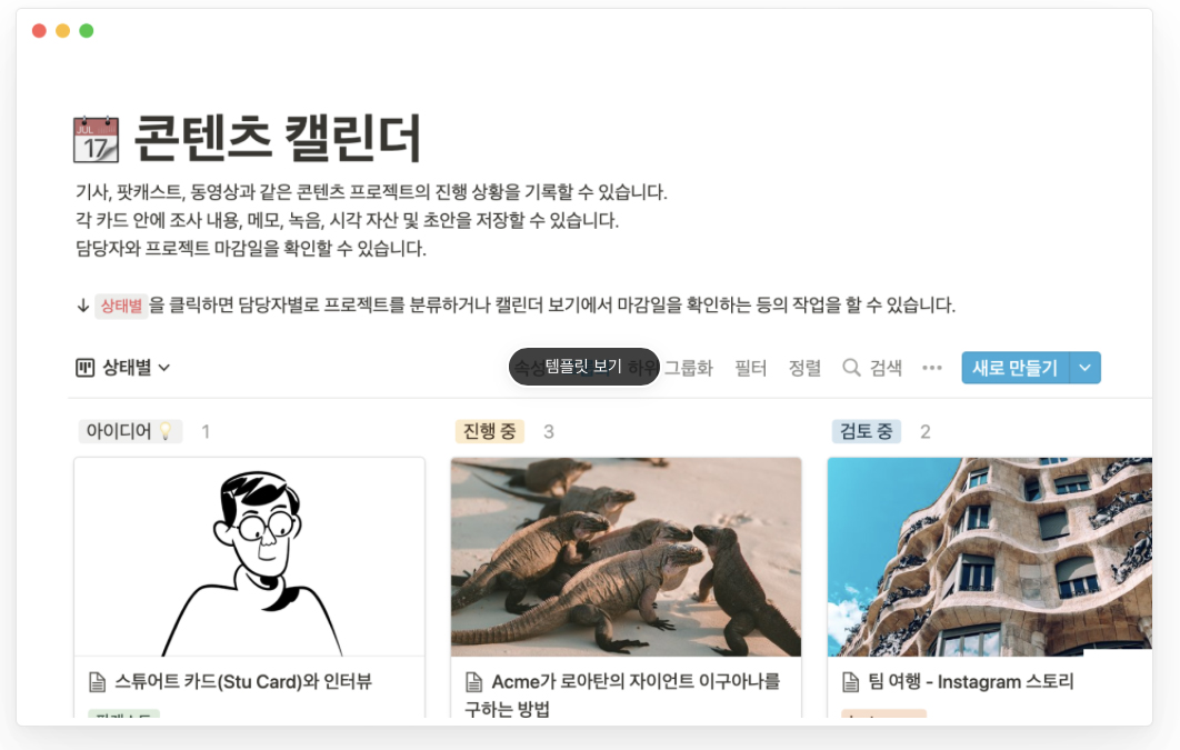 노션은 다양한 템플릿을 제공하여 사용자가 빠르게 작업을 시작할 수 있게 도와줍니다. 이 템플릿들은 일반적인 작업 흐름에 맞춰져 있어, 별도의 설정 없이 바로 활용할 수 있습니다.