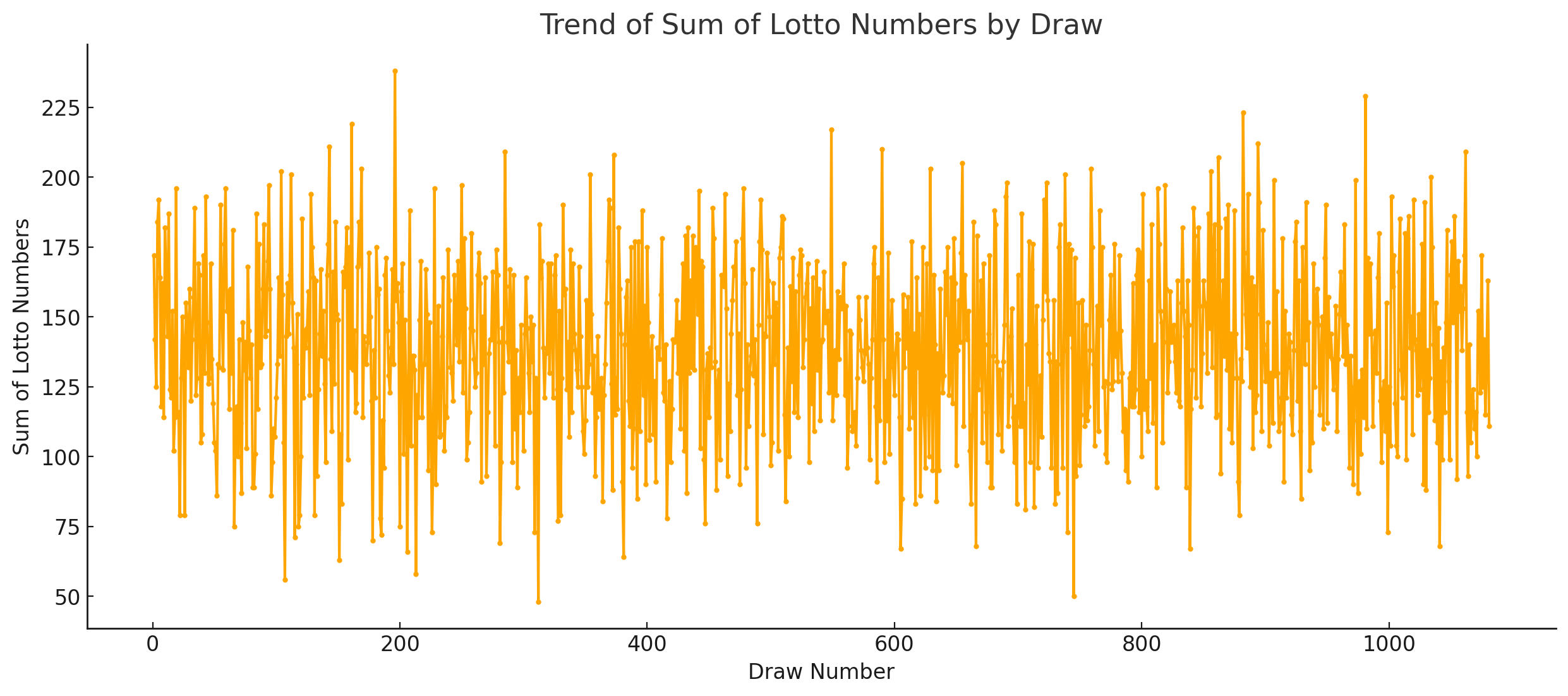 위 그래프는 각 회차별로 로또 번호의 합계를 나타냅니다. 전반적인 추세는 랜덤하게 나타나지만, 일정 범위 내에서 변동하는 것을 확인할 수 있습니다.